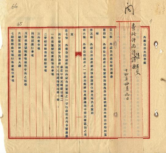 作者不詳(民國14年04月)。[件名:外蒙自治大綱草案]。《數位典藏與數位學習聯合目錄》。http://catalog.digitalarchives.tw/item/00/0a/ca/89.html(2025/05/20瀏覽)。