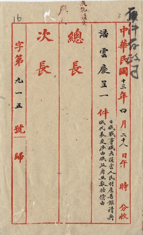 潘雲慶(民國13年04月)。[件名:日俄戰事俄兵損害人民財產甚鉅請俄政府照數賠償由]。《數位典藏與數位學習聯合目錄》。http://catalog.digitalarchives.tw/item/00/0a/cc/05.html(2025/05/20瀏覽)。