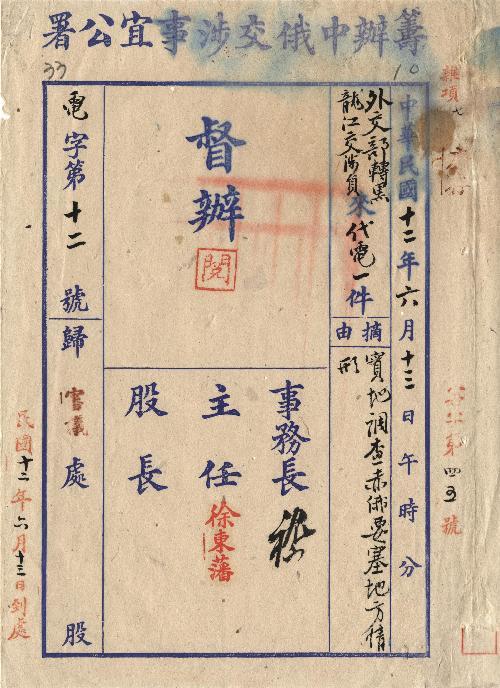 黑龍江交涉員(民國12年06月)。[件名:實地調查赤俄要塞情形事]。《數位典藏與數位學習聯合目錄》。http://catalog.digitalarchives.tw/item/00/0a/d2/5b.html(2025/05/20瀏覽)。