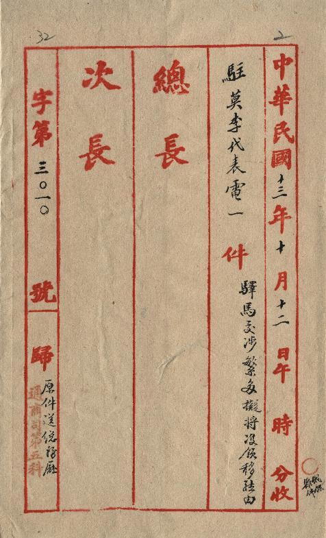 駐莫李代表(民國13年10月)。[件名:驛馬交涉繁多擬將將領移駐由]。《數位典藏與數位學習聯合目錄》。http://catalog.digitalarchives.tw/item/00/0a/d2/ce.html(2025/05/20瀏覽)。