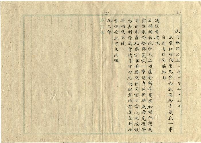 內務部(民國08年02月)。[件名:給予敵僑夏衣事由]。《數位典藏與數位學習聯合目錄》。http://catalog.digitalarchives.tw/item/00/0b/36/9e.html(2025/05/20瀏覽)。