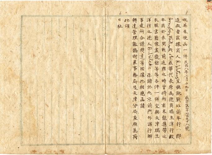 英朱使(民國08年02月)。[件名:商人瓦德於歐戰前寄存各物件於瑞生洋行辦事處請轉達]。《數位典藏與數位學習聯合目錄》。http://catalog.digitalarchives.tw/item/00/0b/52/30.html(2025/05/20瀏覽)。