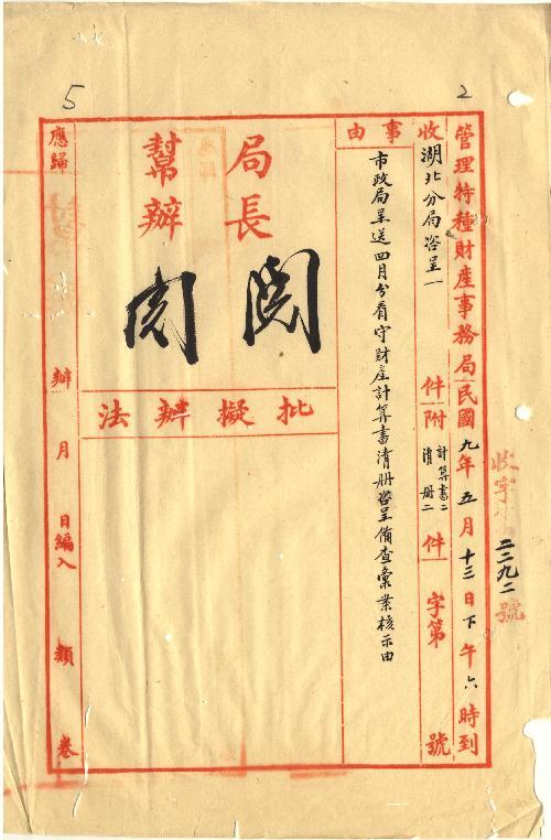 湖北分局(民國09年05月)。[件名:市政局呈送四月分看守財產計算書清冊咨呈備查彙案核示由]。《數位典藏與數位學習聯合目錄》。http://catalog.digitalarchives.tw/item/00/0b/54/1b.html(2025/05/20瀏覽)。