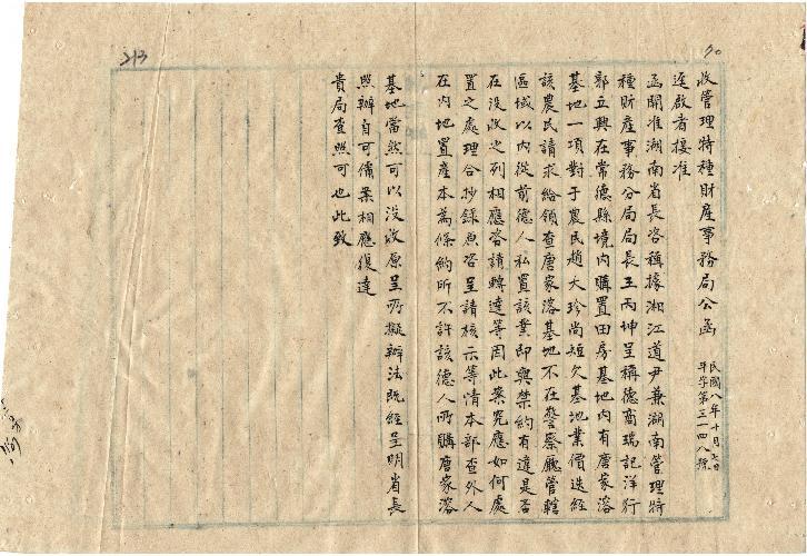 外交部(民國08年10月)。[件名:德商瑞記洋行在常德地產湘省所擬沒收辦法尚屬可行]。《數位典藏與數位學習聯合目錄》。http://catalog.digitalarchives.tw/item/00/0b/55/5a.html(2025/05/20瀏覽)。
