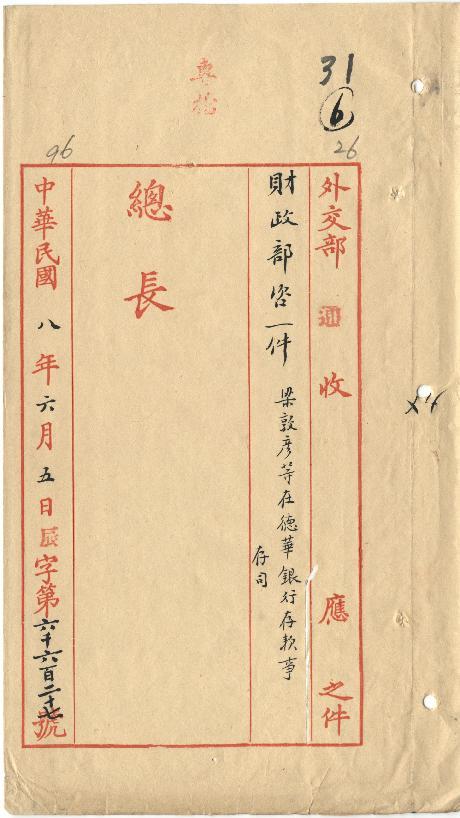 財政部(民國08年06月)。[件名:梁敦彥等在德華銀行存款事]。《數位典藏與數位學習聯合目錄》。http://catalog.digitalarchives.tw/item/00/0b/57/52.html(2025/05/20瀏覽)。