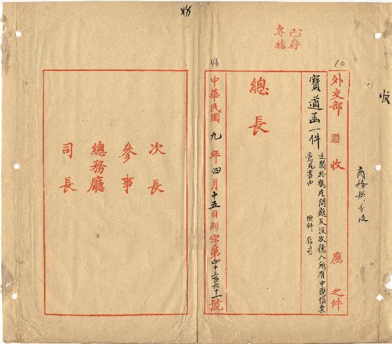 寶道(民國09年04月)。[件名:送關於鴉片問題及沒收德人所有中國債票意見書由]。《數位典藏與數位學習聯合目錄》。http://catalog.digitalarchives.tw/item/00/0b/57/85.html(2025/05/20瀏覽)。