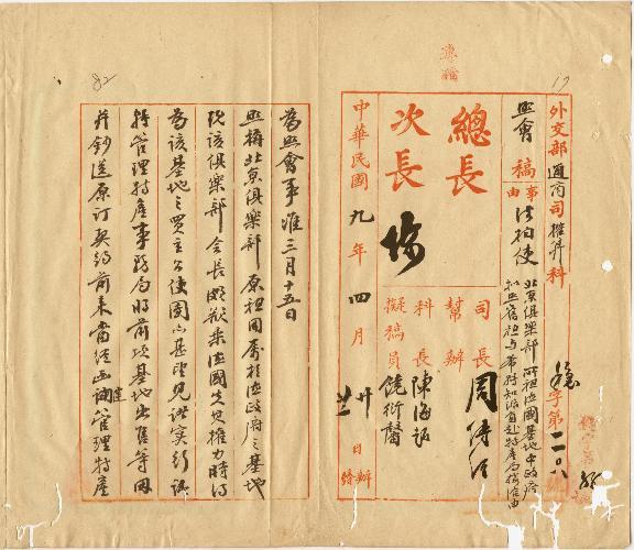 外交部(民國09年04月)。[件名:北京俱樂部所租德國基地中政府擬照舊租與希轉知派員赴特產局接洽由]。《數位典藏與數位學習聯合目錄》。http://catalog.digitalarchives.tw/item/00/0b/57/a8.html(2025/05/20瀏覽)。