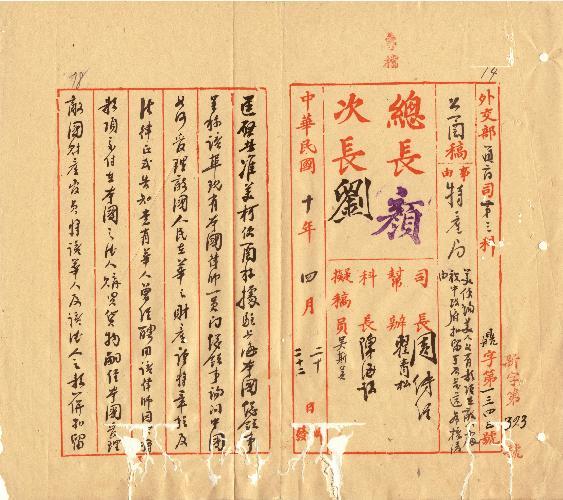 外交部(民國10年04月)。[件名:美使詢美人如有款項在敵人處被中政府扣留可否發還希核復由]。《數位典藏與數位學習聯合目錄》。http://catalog.digitalarchives.tw/item/00/0b/58/13.html(2025/05/20瀏覽)。