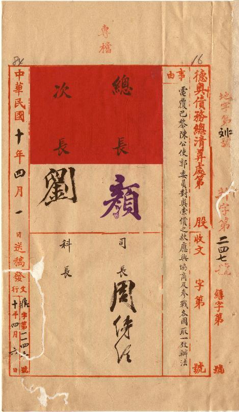 外交部(民國10年04月)。[件名:電復巴黎陳公使郭委員對奧索價之款應與協商參戰各國取一致辦法由]。《數位典藏與數位學習聯合目錄》。http://catalog.digitalarchives.tw/item/00/0b/58/15.html(2025/05/20瀏覽)。