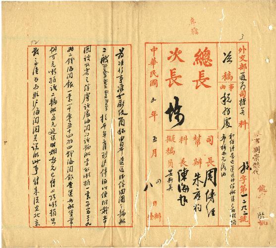 外交部(民國09年05月)。[件名:和使請發還運送德俘船隻已納噸捐希核辦見復由]。《數位典藏與數位學習聯合目錄》。http://catalog.digitalarchives.tw/item/00/0b/58/ef.html(2025/05/20瀏覽)。