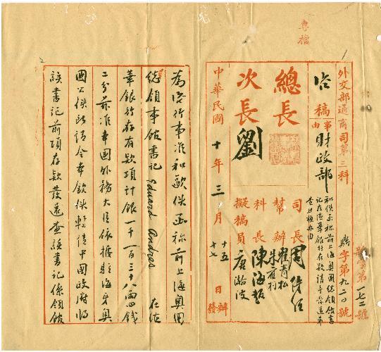 外交部(民國11年03月)。[件名:和使函稱前上海奧國總領館書記在德華銀行存款請予發還希查照核辦由]。《數位典藏與數位學習聯合目錄》。http://catalog.digitalarchives.tw/item/00/0b/59/44.html(2025/05/20瀏覽)。