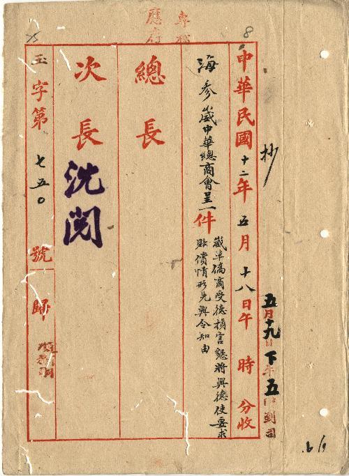 海參崴中華總商會(民國12年05月)。[件名:崴埠僑商受德損害懇將與德使要求賠償情形先與令知由]。《數位典藏與數位學習聯合目錄》。http://catalog.digitalarchives.tw/item/00/0b/5c/0e.html(2025/05/20瀏覽)。