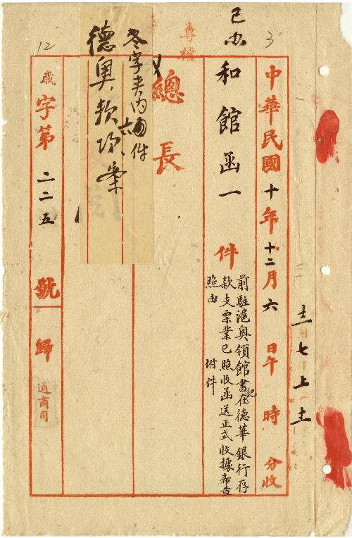 和館(民國10年12月)。[件名:前駐滬奧領館書記在德華銀行存款支票業已照收函送正式收據希查照由]。《數位典藏與數位學習聯合目錄》。http://catalog.digitalarchives.tw/item/00/0b/5d/42.html(2025/05/20瀏覽)。
