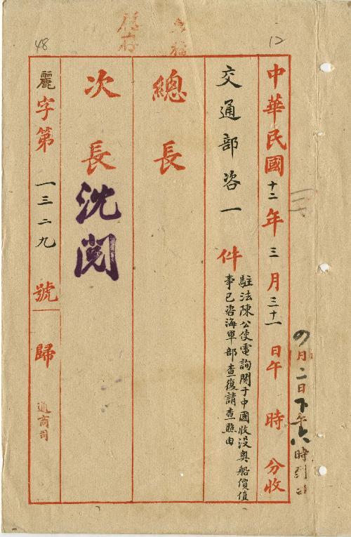 交通部(民國12年03月)。[件名:駐法陳公使電詢關於中國收沒奧船價值事已咨海軍部查復請查照由]。《數位典藏與數位學習聯合目錄》。http://catalog.digitalarchives.tw/item/00/0b/5d/c3.html(2025/05/20瀏覽)。