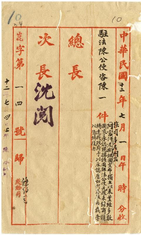 駐法陳公使(民國12年07月)。[件名:埃斯多尼國各阿富汗尼斯坦國宣布獨立以來業經多數國家承認現據駐法各該國公使先後來館商請轉達我政府予以承認如何答復希裁奪轉復]。《數位典藏與數位學習聯合目錄》。http://catalog.digitalarchives.tw/item/00/0b/5f/9f.html(2025/05/20瀏覽)。