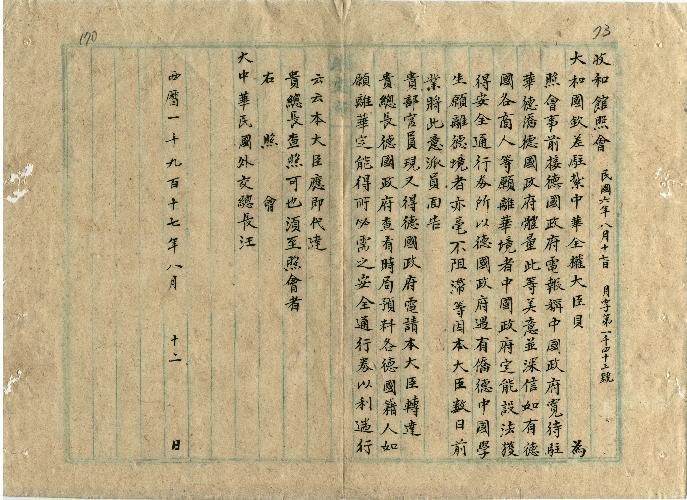 和館(民國06年08月)。[件名:前接德政府電稱中國政府寬待德僑德政府遇有中國學生願離德境者亦毫無阻滯]。《數位典藏與數位學習聯合目錄》。http://catalog.digitalarchives.tw/item/00/0b/60/c0.html(2025/05/20瀏覽)。