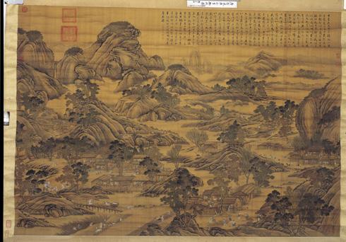 石渠寶笈三編(延春閣),第六冊,頁2742&*故宮書畫錄(卷八),第四冊,頁135 &*故宮書畫圖錄,第十四冊,頁367-368&* 唐岱與沈源,都是十八世紀左右,供奉於清宮內廷的畫家。 「豳」為古代國名。成王即位後,周公攝政,作豳風七月之詩一篇,述后稷公劉政教之始。述其政教之中,則為豳雅,述其政教之成,則為豳頌,以戒成王。畫面上方有張照所抄錄的全篇詩文,圖中情境全是依照詩文內容而加以表達,設色明麗豐富,用筆熟練,是幅詩畫合一的典型宮廷繪畫。 &* T’ang Tai and Shen Yüan served as court painters in the Ch’ing during the 18th century. Pin was the name of an ancient state in China. When Prince Ch’eng assumed leadership, the Duke of Chou acted as regent and composed the poem “ The Seventh Month”. Part of The Odes of Pin, it was a means of instruction for governing. The process of governing was known as the Ceremonies of Pin, and the achievements known as the Hymns of Pin. They were intended as advice for Prince Ch’eng. At the top of this work is Chang Chao’s transcription of the entire verse. The contents of the imagery are based on the verse. The coloring is opulent and the brushwork mature. This combination of poetry and imagery is a classic example of court painting.