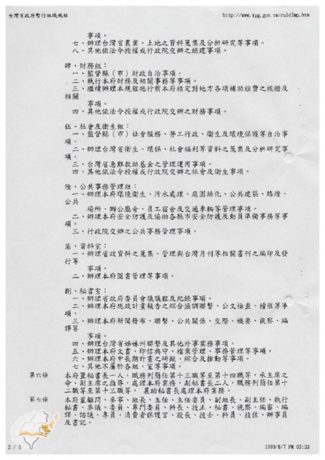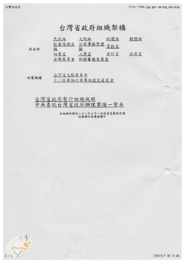 作者不詳(1999-08-09)。[案由:臺灣省政府第三次主管會報議程附件]。《數位典藏與數位學習聯合目錄》。http://catalog.digitalarchives.tw/item/00/36/cc/bf.html(2025/01/06瀏覽)。