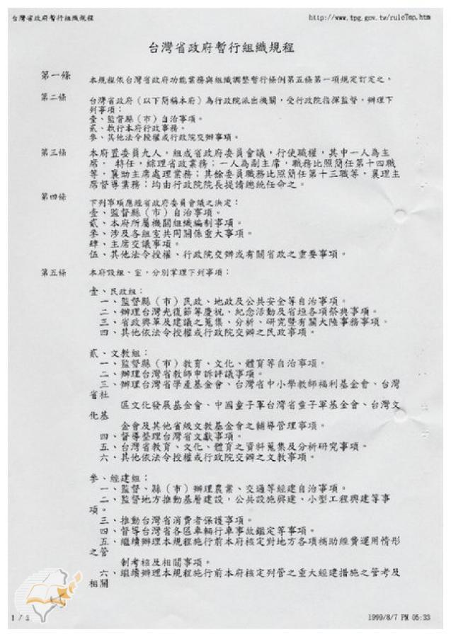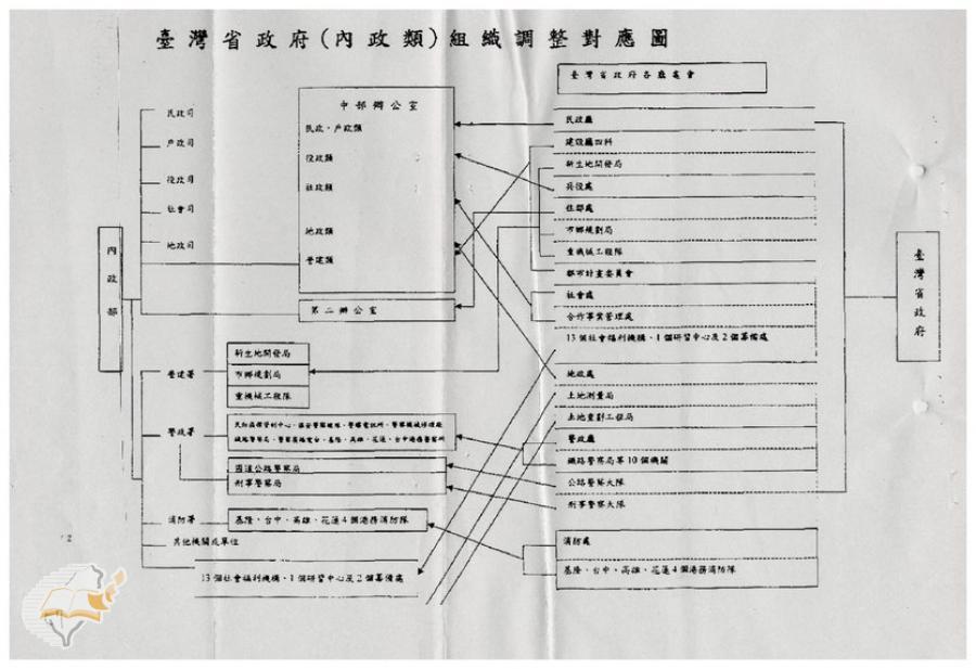 內容描述:臺灣省政府組織架構;臺灣省政府暫行組織規程;臺灣省政府(內政類)組織調整對應圖