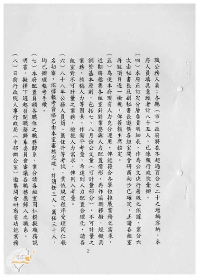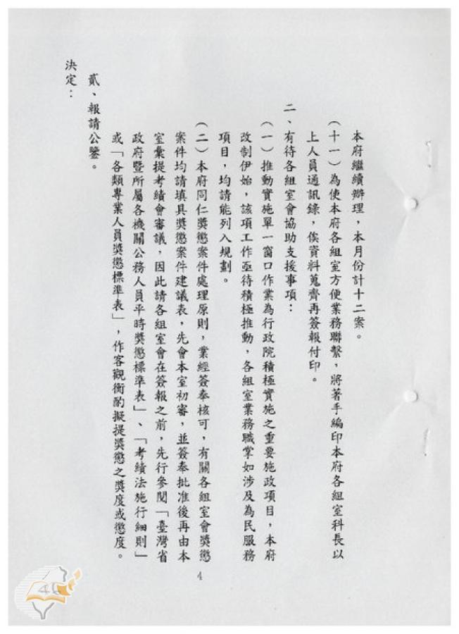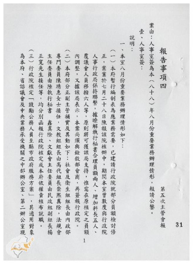 人事室(1999-09-13)。[案由:人事室簽為八十八年八月份重要業務辦理情形報請公鑒案。]。《數位典藏與數位學習聯合目錄》。http://catalog.digitalarchives.tw/item/00/36/cc/cf.html(2025/01/06瀏覽)。