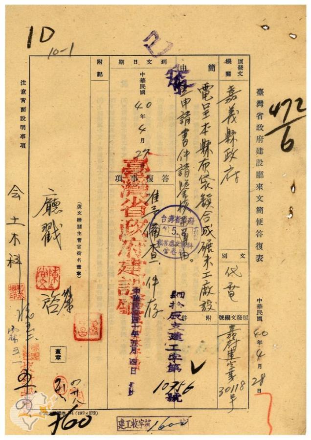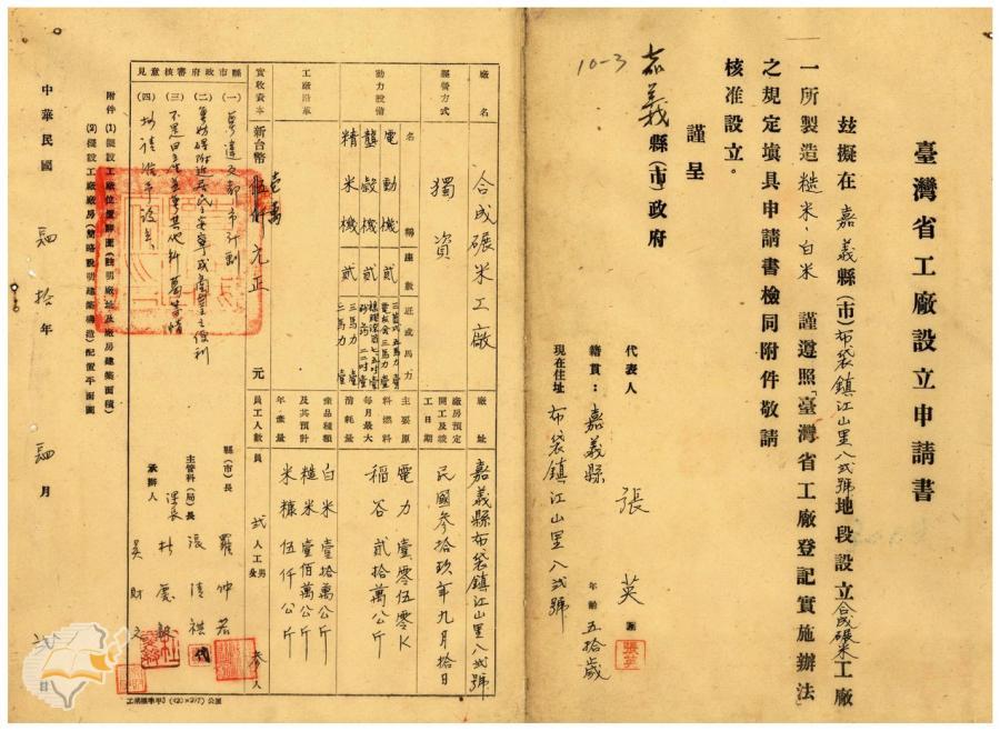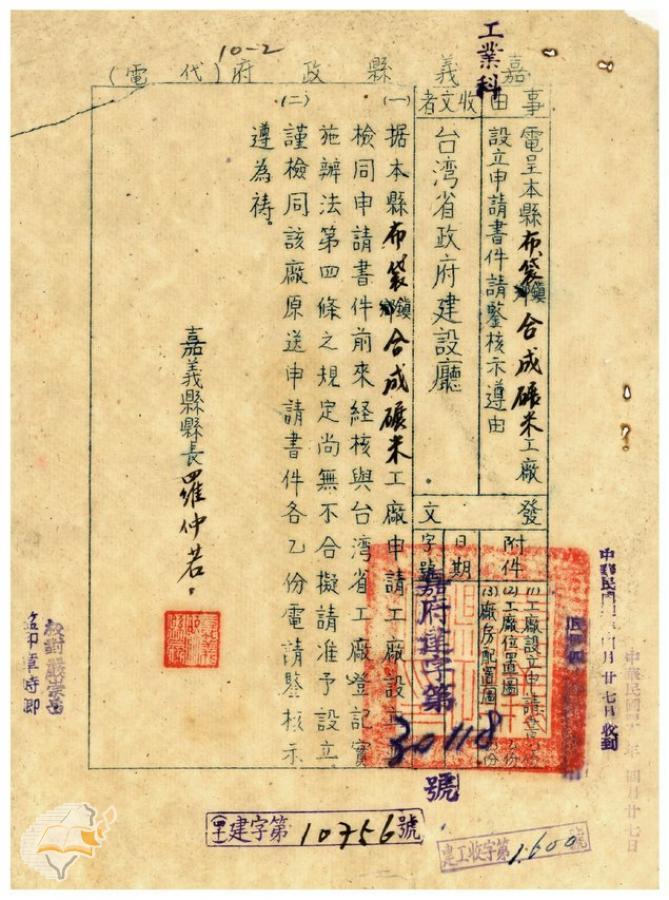 台灣省政府建設廳(1951-05-04)。[案由:電呈本縣布袋鎮合成碾米工廠設立申請書件請鑒核示遵由]。《數位典藏與數位學習聯合目錄》。http://catalog.digitalarchives.tw/item/00/41/db/49.html(2025/01/03瀏覽)。