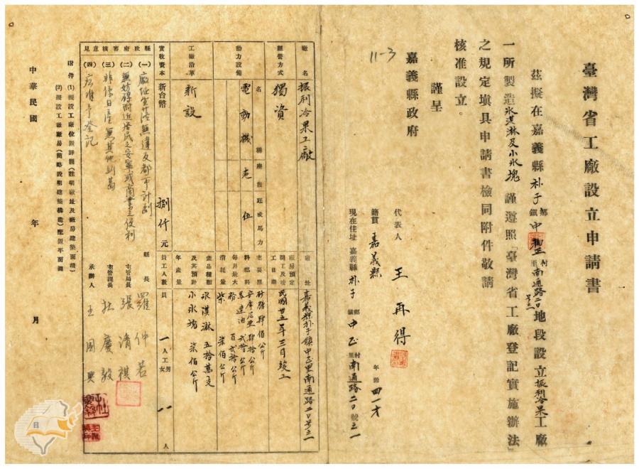 台灣省政府建設廳(1951-05-16)。[案由:電呈本縣振利果工廠設立申請書件請鑒核示遵由]。《數位典藏與數位學習聯合目錄》。http://catalog.digitalarchives.tw/item/00/41/db/4a.html(2025/01/03瀏覽)。