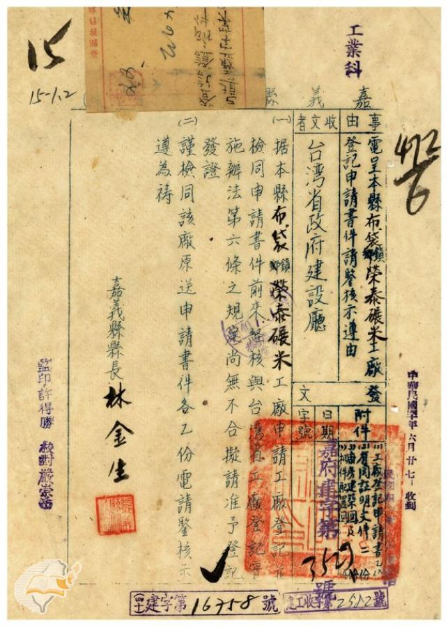 嘉義縣政府(1951-07-03)。[案由:電呈本縣布袋鎮榮泰碾米工廠登記申請書件請鑒核示遵由]。《數位典藏與數位學習聯合目錄》。http://catalog.digitalarchives.tw/item/00/41/db/62.html(2025/01/03瀏覽)。