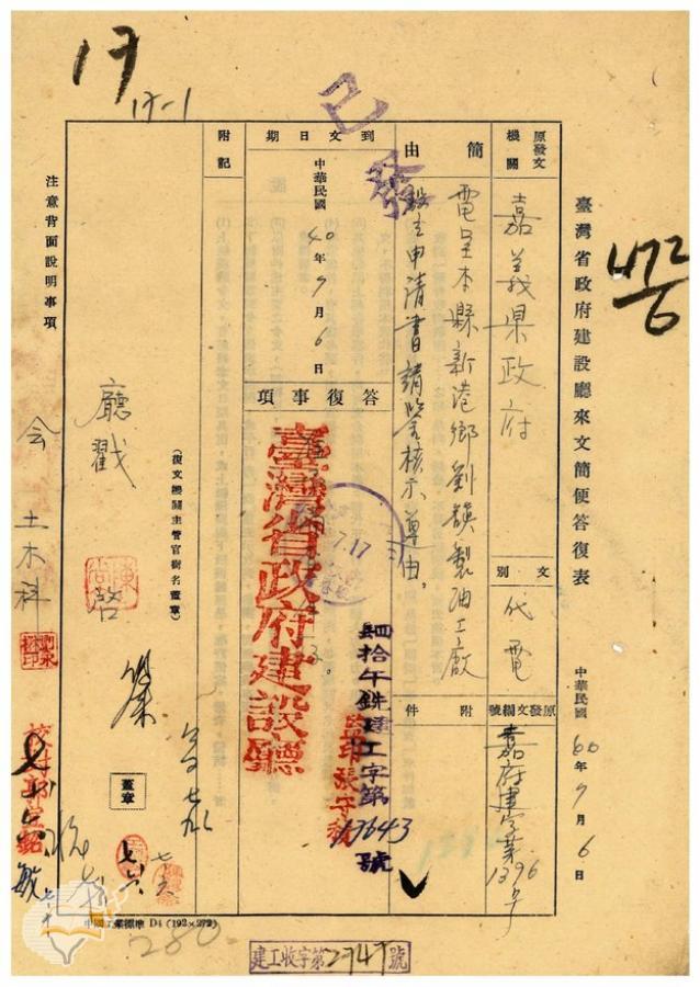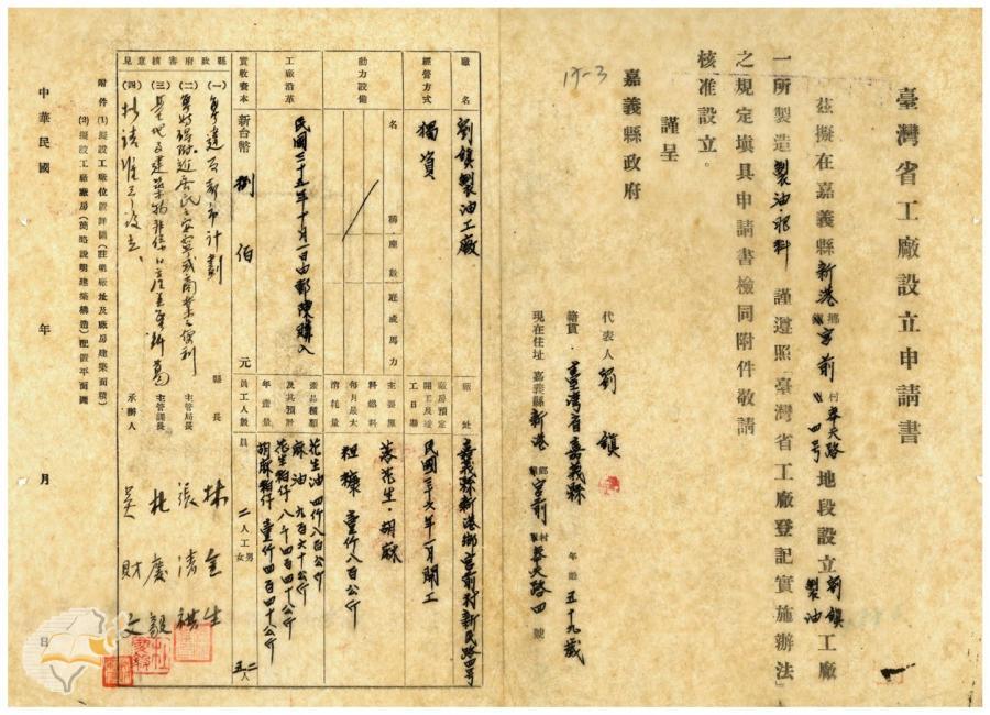 台灣省政府建設廳(1951-07-16)。[案由:電呈本縣新港鄉劉鎮製油工廠設立申請書件請鑒核示遵由]。《數位典藏與數位學習聯合目錄》。http://catalog.digitalarchives.tw/item/00/41/db/64.html(2025/01/03瀏覽)。