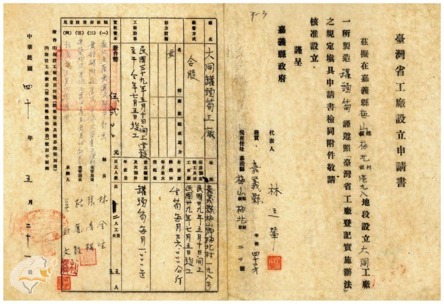 案由:電呈本縣梅山鄉大同罐頭筍工廠設立申請書件請鑒核示遵由