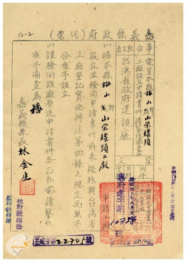 台灣省政府建設廳(1951-09-01)。[案由:電呈本縣梅山鄉山榮罐頭工廠設立申請書件請鑒核備查由]。《數位典藏與數位學習聯合目錄》。http://catalog.digitalarchives.tw/item/00/41/db/73.html(2025/01/03瀏覽)。