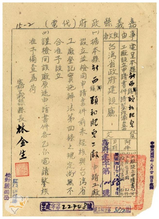 案由:電呈該縣嘉義市延陵冷果部工廠設...