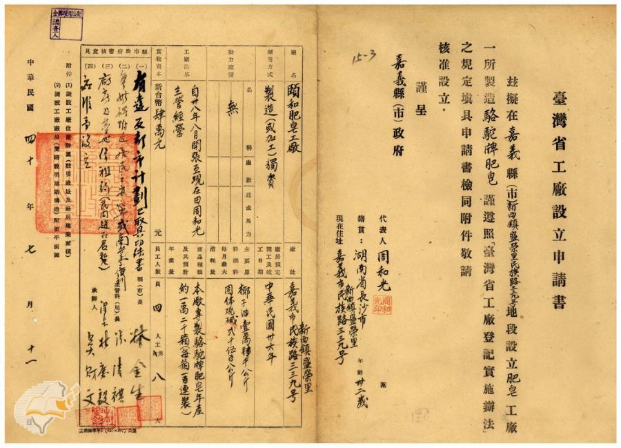 台灣省政府建設廳(1951-09-01)。[案由:電呈本縣新西鎮頤和肥皂工廠設立申請書件請鑒核備查由]。《數位典藏與數位學習聯合目錄》。http://catalog.digitalarchives.tw/item/00/41/db/76.html(2025/01/03瀏覽)。