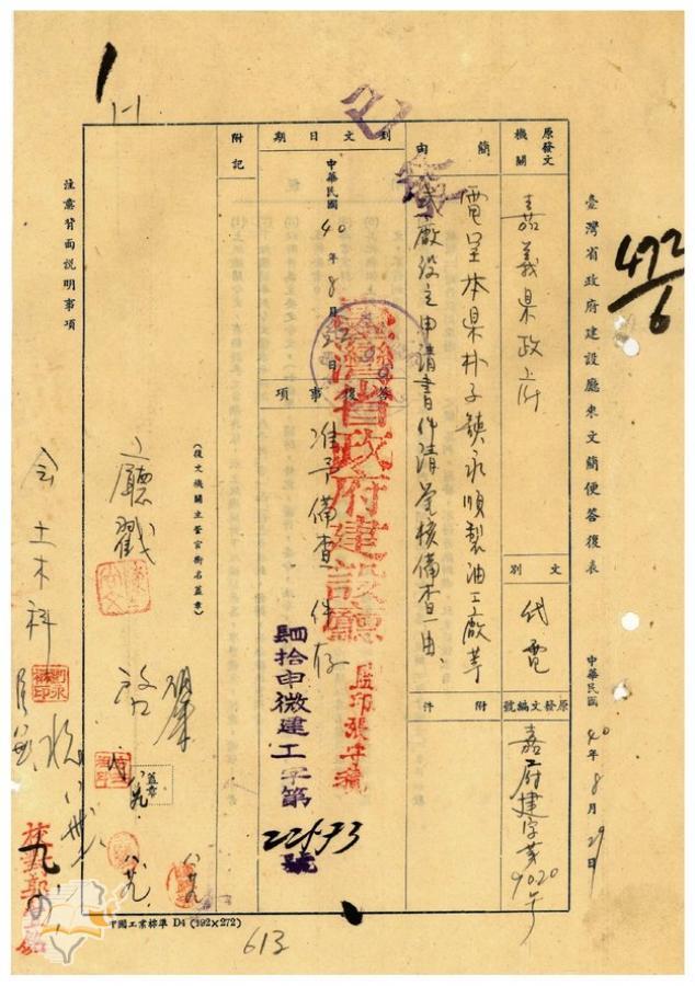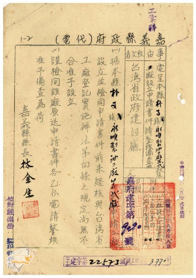 案由:電呈本縣朴子鎮永順製油工廠等貳廠設立申請書件請鑒核備查由