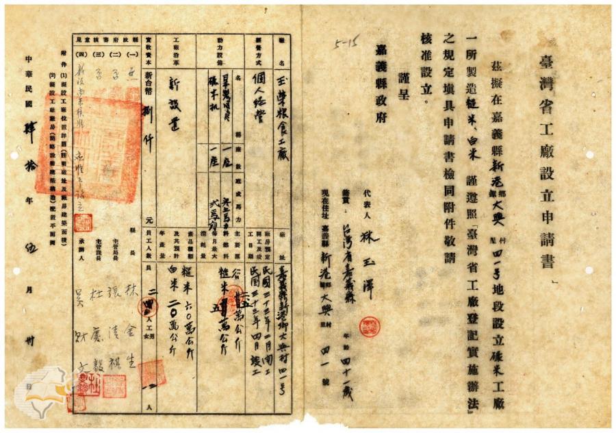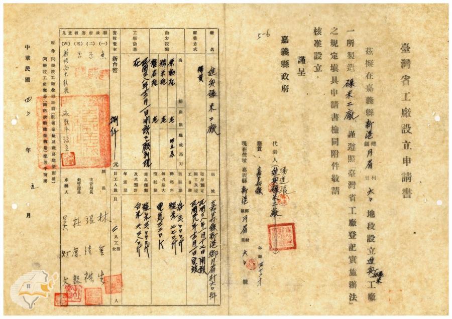 案由:電呈本縣太保鄉連豐碾米工廠設立...