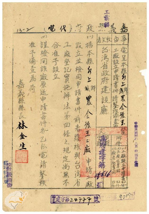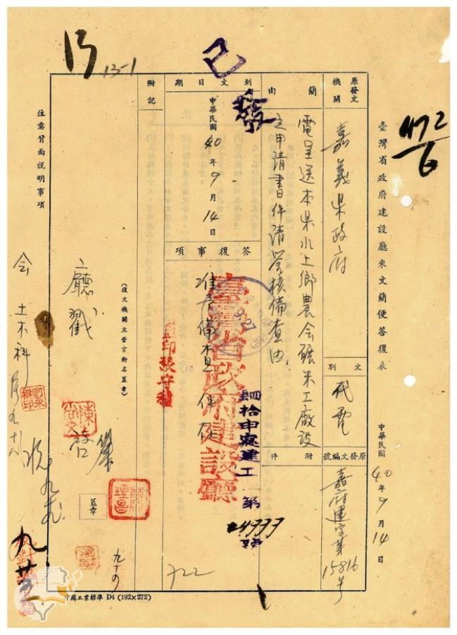 台灣省政府建設廳(1951-09-25)。[案由:電呈送本縣水上鄉農會碾米工廠設立申請書件請鑒核備查由]。《數位典藏與數位學習聯合目錄》。http://catalog.digitalarchives.tw/item/00/41/db/88.html(2025/01/03瀏覽)。
