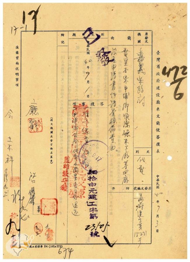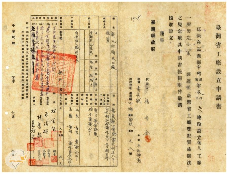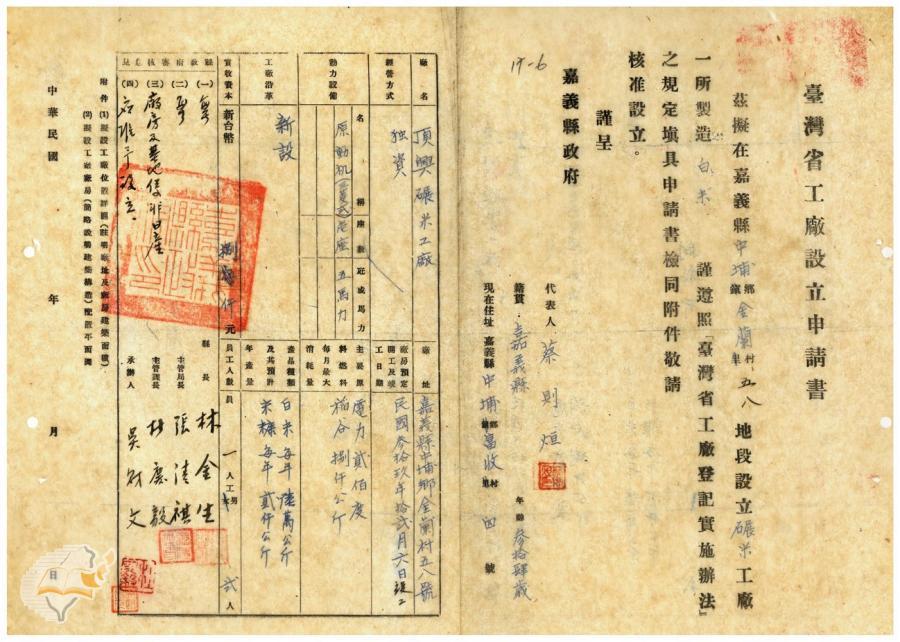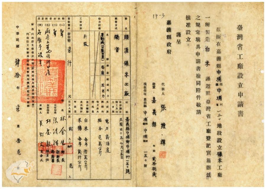 台灣省政府建設廳(1951-09-12)。[案由:電呈送本縣中埔鄉順源碾米工廠等設立申請書件請鑒核備查由]。《數位典藏與數位學習聯合目錄》。http://catalog.digitalarchives.tw/item/00/41/db/8c.html(2025/01/03瀏覽)。