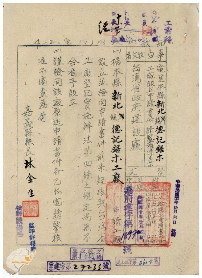 台灣省政府建設廳(1951-10-08)。[案由:電呈該縣新北鎮德紀鋸木工廠設立申請書件請准予備查]。《數位典藏與數位學習聯合目錄》。http://catalog.digitalarchives.tw/item/00/41/db/93.html(2025/01/03瀏覽)。