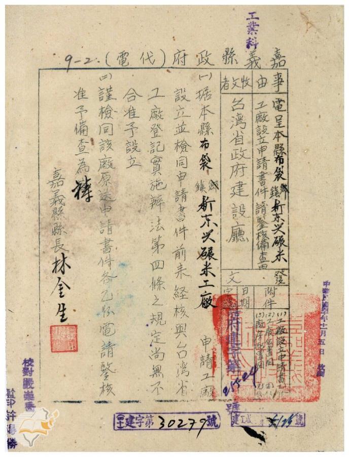 台灣省政府建設廳(1951-11-07)。[案由:電呈該縣布袋鎮新東興碾米工廠設立申請書件准予備查]。《數位典藏與數位學習聯合目錄》。http://catalog.digitalarchives.tw/item/00/41/db/ac.html(2025/01/03瀏覽)。