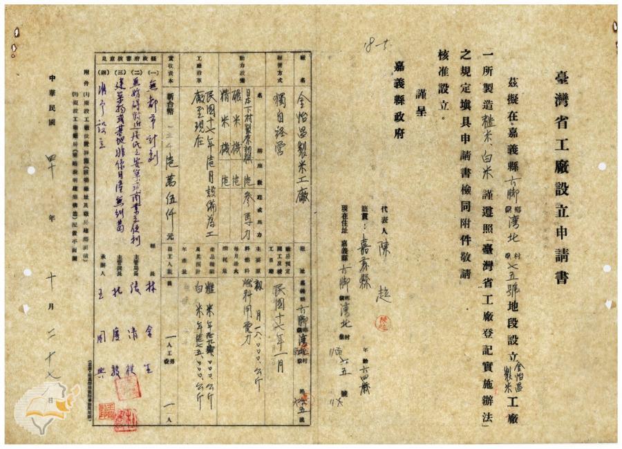 案由:電呈送該縣六腳鄉合發碾米工廠等設立申請書件准予備查