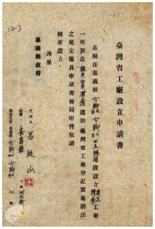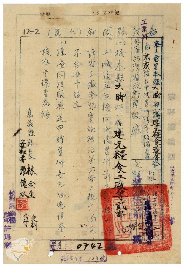案由:電呈該縣六腳鄉建元糧食工廠等二家設立申請書件請鑒核備查由
