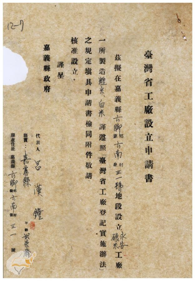 案由:電呈本縣東石鄉林碾米管工廠登記...