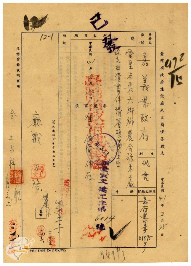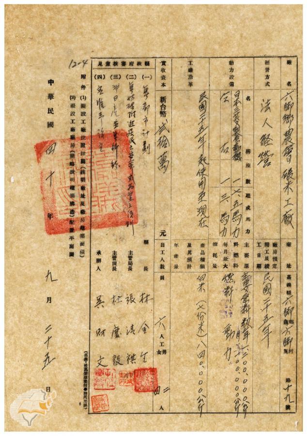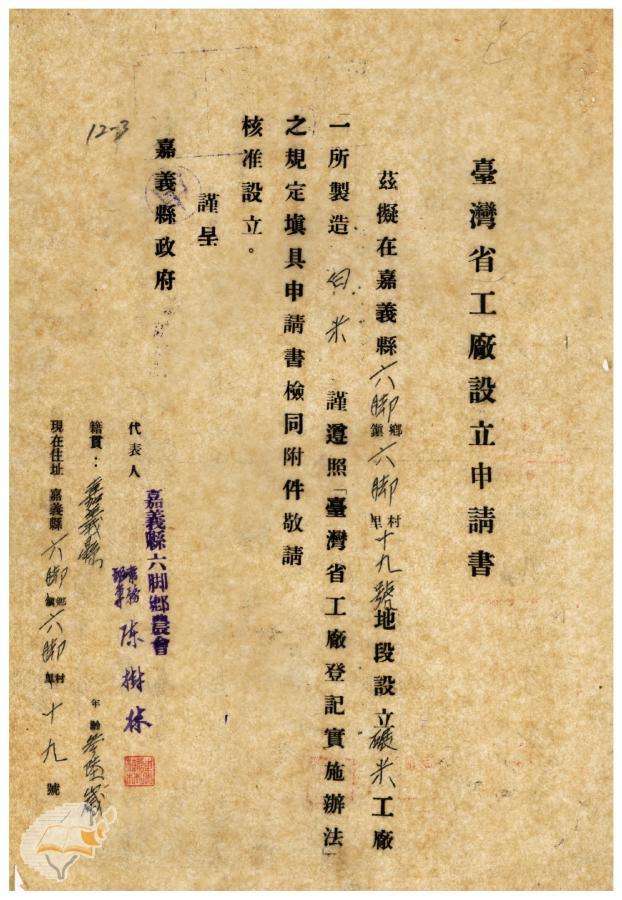 臺灣省政府建設廳(1952-03-10)。[案由:電呈該縣六腳鄉農會碾米工廠設立申請書件請鑒核備查由]。《數位典藏與數位學習聯合目錄》。http://catalog.digitalarchives.tw/item/00/41/f4/89.html(2025/01/03瀏覽)。