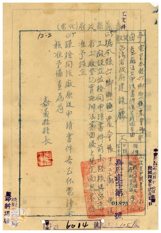 案由:電呈該縣六腳鄉農會碾米工廠設立申請書件請鑒核備查由