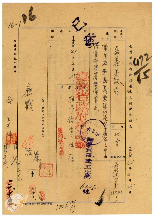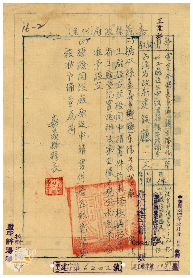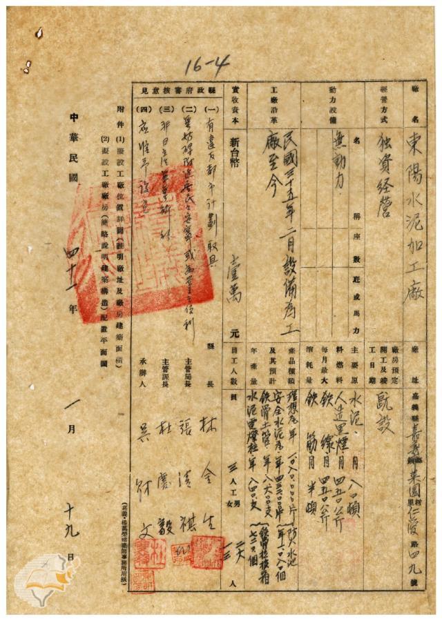 臺灣省政府建設廳(1952-03-14)。[案由:電呈該縣嘉義東陽水泥加工廠設立申請書件請鑒核備查由]。《數位典藏與數位學習聯合目錄》。http://catalog.digitalarchives.tw/item/00/41/f4/8d.html(2025/01/03瀏覽)。