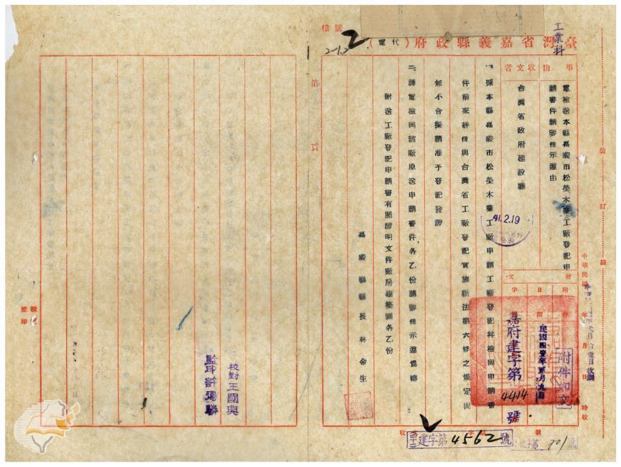 嘉義縣政府(1952-02-09)。[案由:電檢送本縣嘉義市松榮木業工廠登記申請書件請鑒核示遵由]。《數位典藏與數位學習聯合目錄》。http://catalog.digitalarchives.tw/item/00/41/f4/a7.html(2025/01/03瀏覽)。