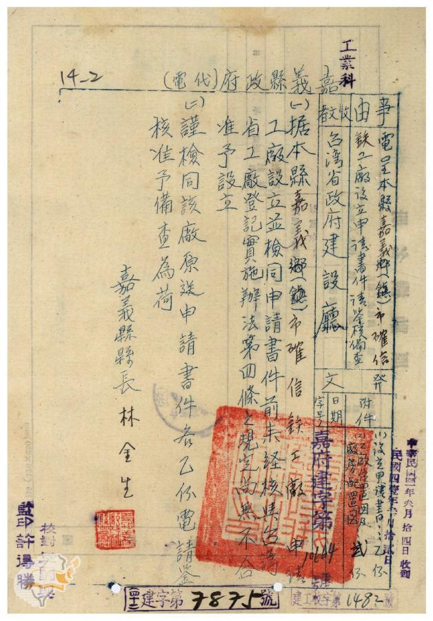案由:電呈送該縣嘉義市確信鐵工廠設立申請書請鑒核備由