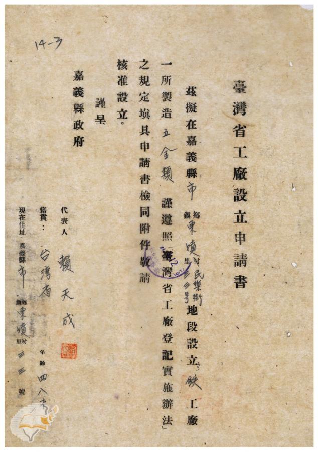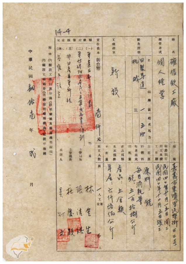 臺灣省政府建設廳(1952-03-15)。[案由:電呈送該縣嘉義市確信鐵工廠設立申請書請鑒核備由]。《數位典藏與數位學習聯合目錄》。http://catalog.digitalarchives.tw/item/00/41/f4/c7.html(2025/01/03瀏覽)。