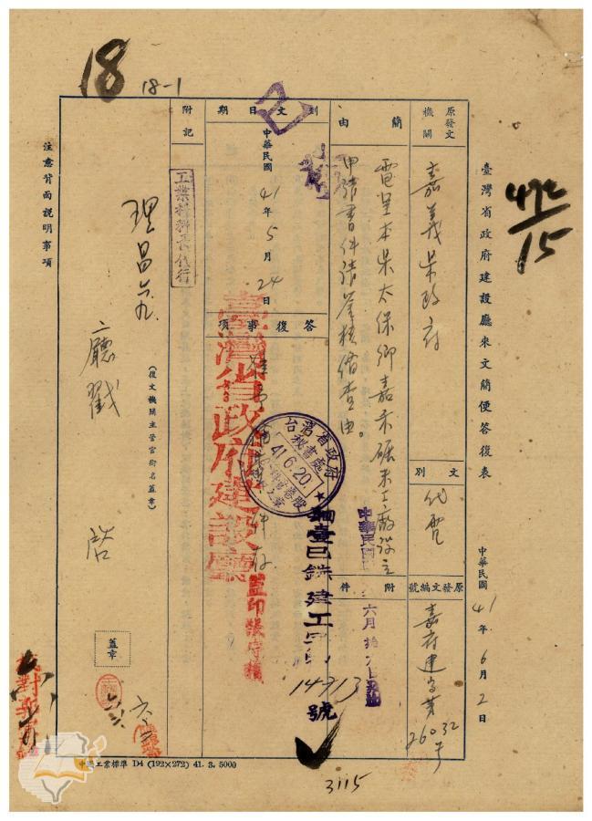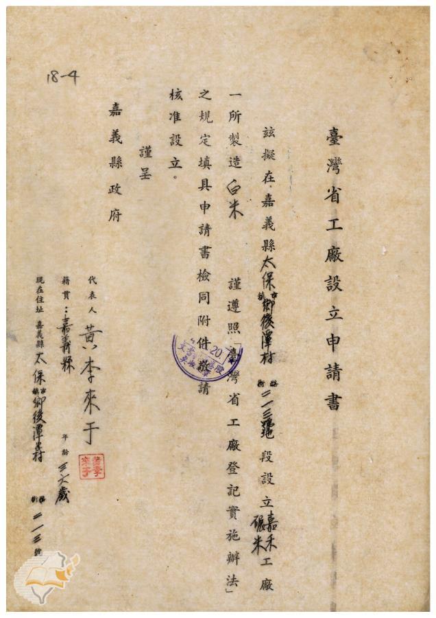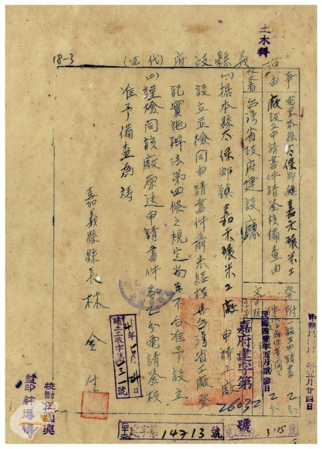臺灣省政府建設廳(1952-06-16)。[案由:電呈太保鄉嘉禾碾米工廠設立申請書請鑒核備查由]。《數位典藏與數位學習聯合目錄》。http://catalog.digitalarchives.tw/item/00/41/f5/09.html(2025/01/03瀏覽)。