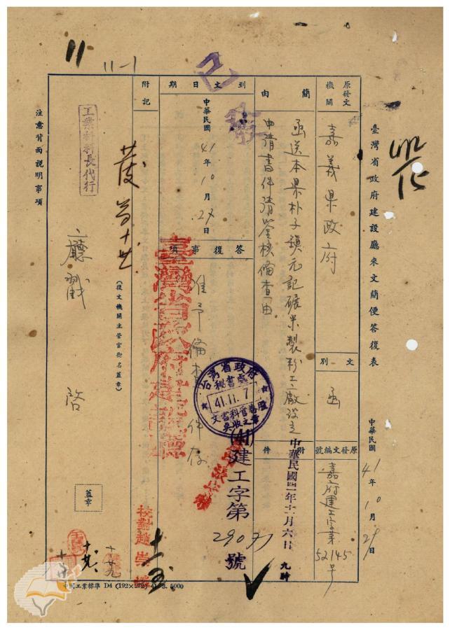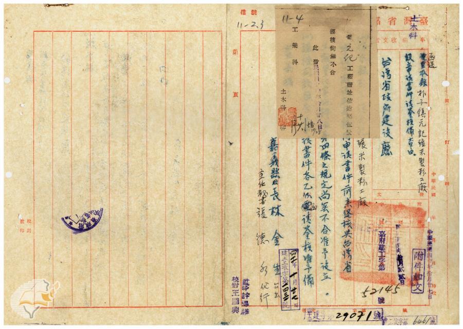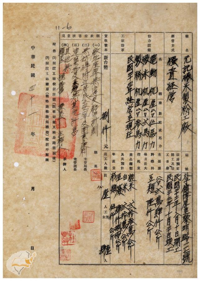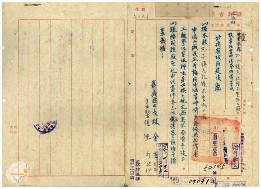 臺灣省政府建設廳(1952-11-06)。[案由:函送嘉義縣朴子鎮元記碾米製分工廠設立申請書請鑒核備查由]。《數位典藏與數位學習聯合目錄》。http://catalog.digitalarchives.tw/item/00/41/f5/68.html(2025/01/03瀏覽)。