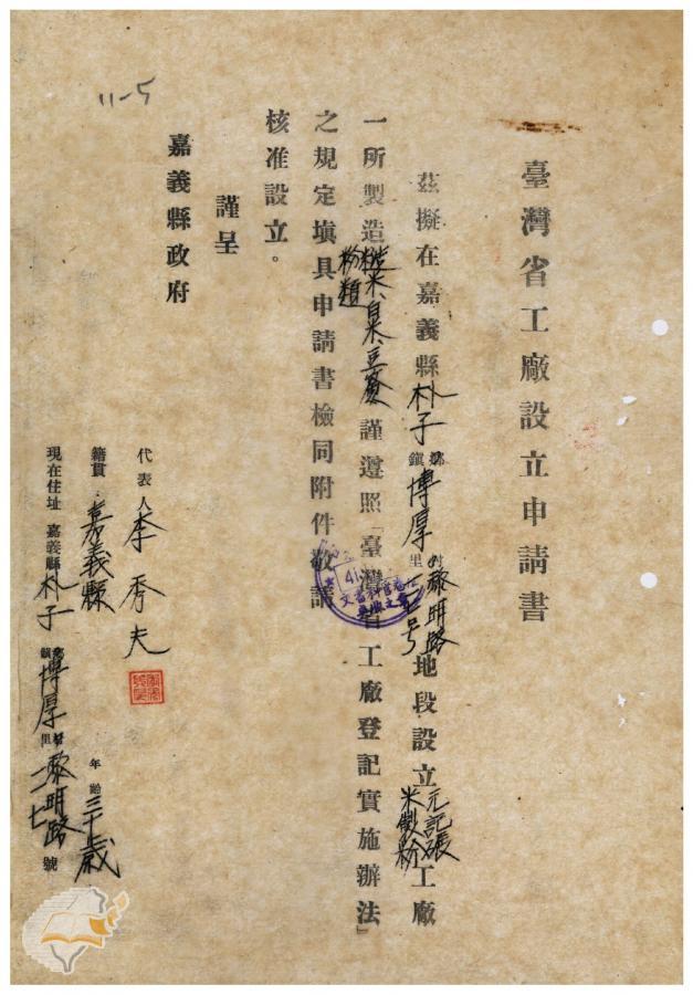 案由:函送嘉義縣朴子鎮元記碾米製分工廠設立申請書請鑒核備查由